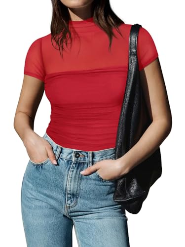 REORIA Women’s Sexy Mock Turtle Neck Short Sleeve Shirts Sheer Mesh Ruched Trendy Going Out Bodysuits Tops